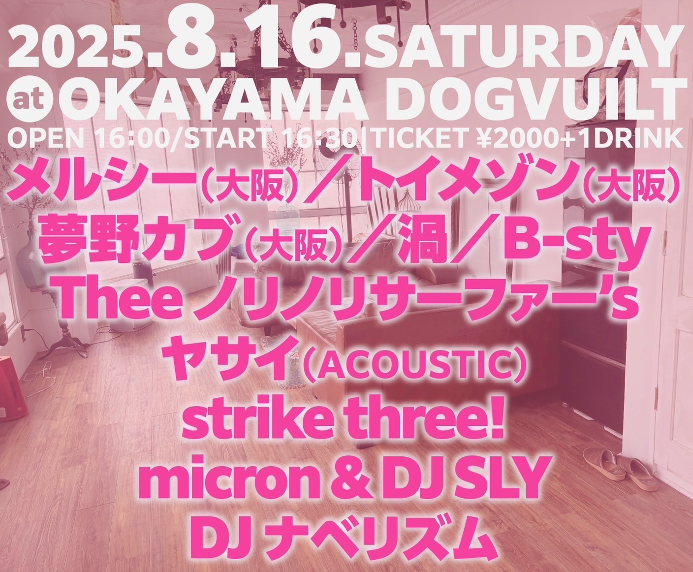 夢野カブ メルシー トイメゾン 渦 B-sty Thee ノリノリサーファー's ヤサイ(ACOUSTIC) strike three! micron & DJ SLY DJ ナベリズム OPEN 16:00 S […]