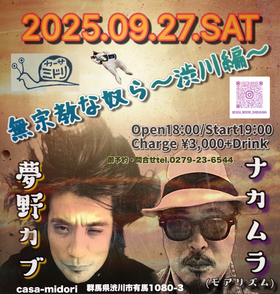 夢野カブ オグラ&ジュンマキ堂 OPEN 18:30 START 19:30 チャージ: 前売 3,000円 当日 3,500円