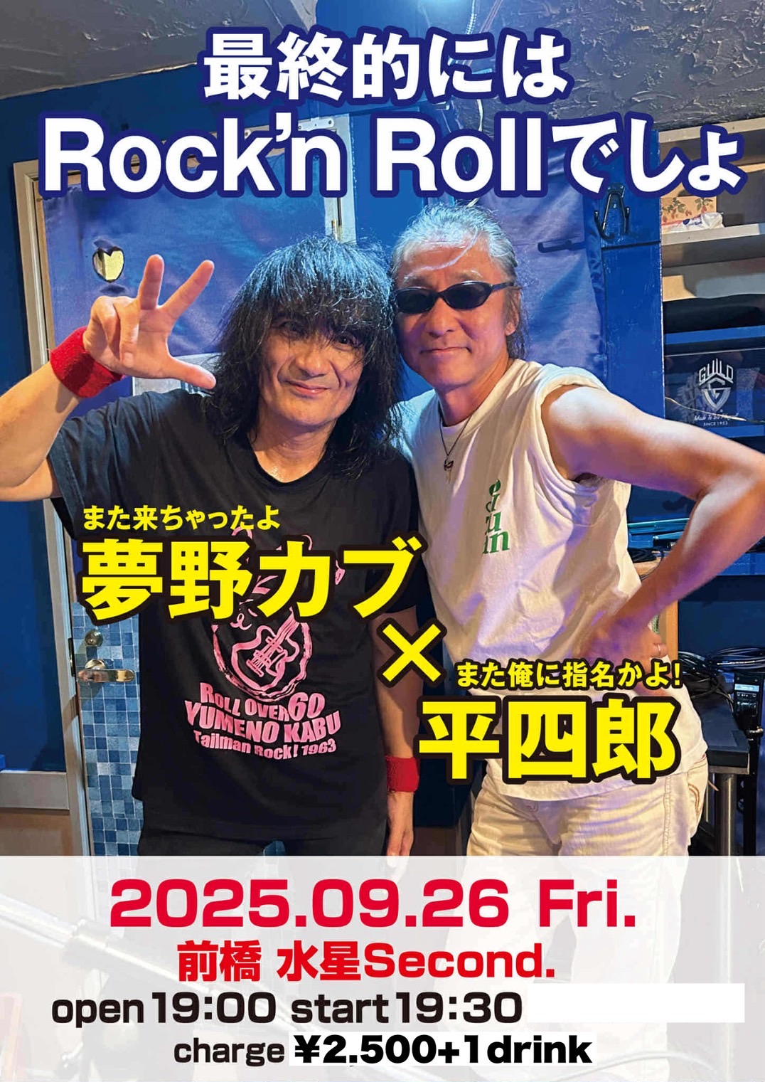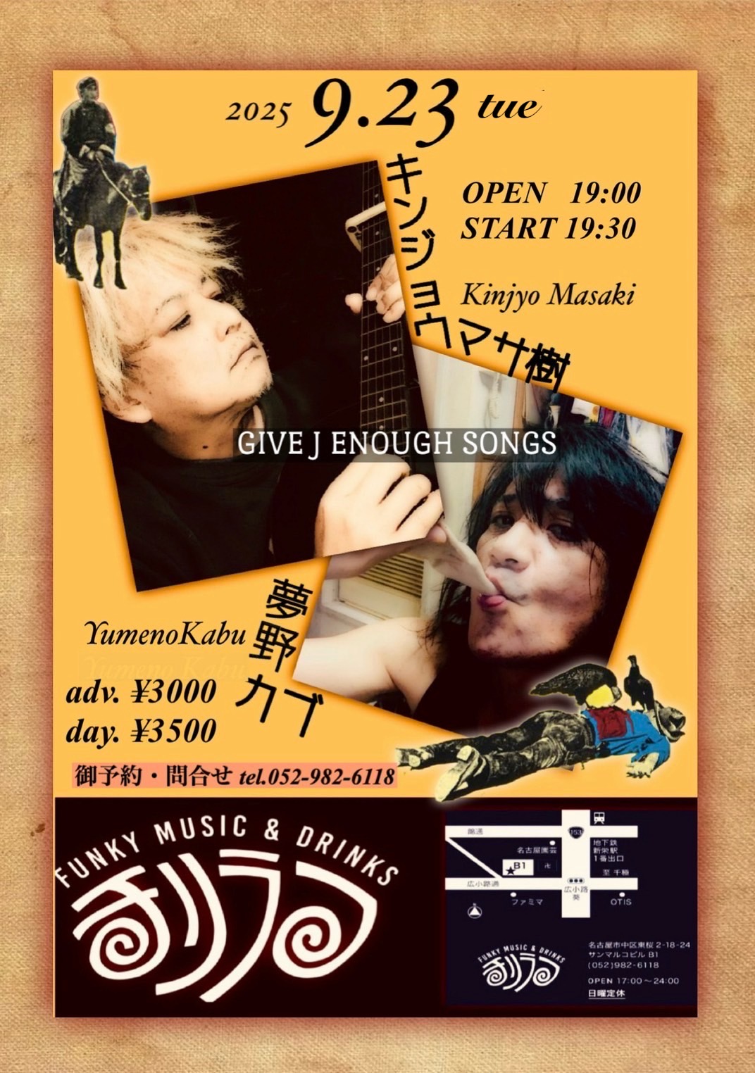 夢野カブ キンジョウマサ樹 OPEN 19:30 START 20:00 チャージ: 前売 2,500円 (2drink別途) 当日 3,000円(2drink別途)