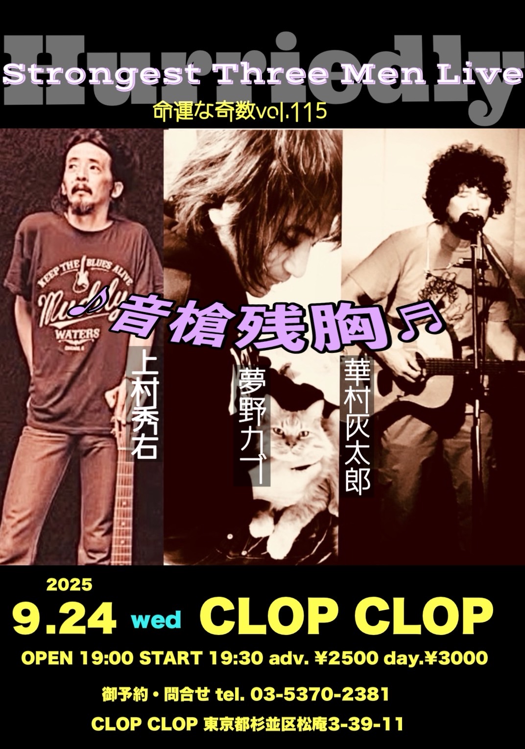 夢野カブ 華村灰太郎 上村秀右 OPEN 19:00 START 19:30 チャージ: 前売 2,500円 当日 3,000円