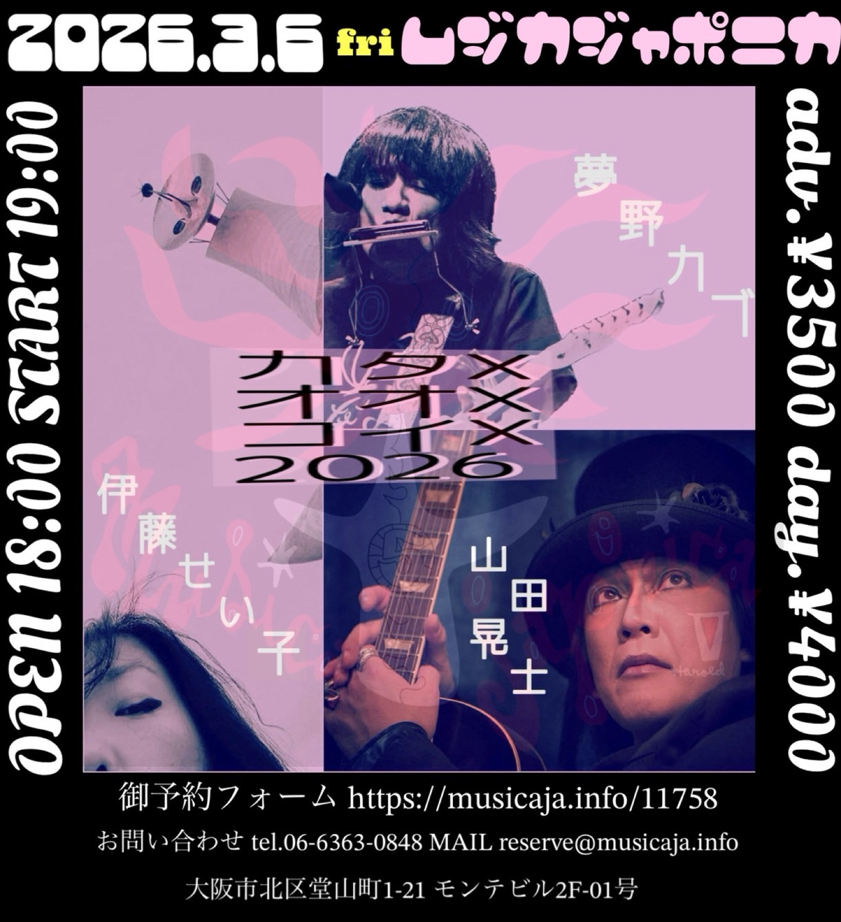 夢野カブ 山田晃士 伊藤せいこ OPEN 18:00 START 19:00 チャージ: 前売 3,500円 当日 4,000円