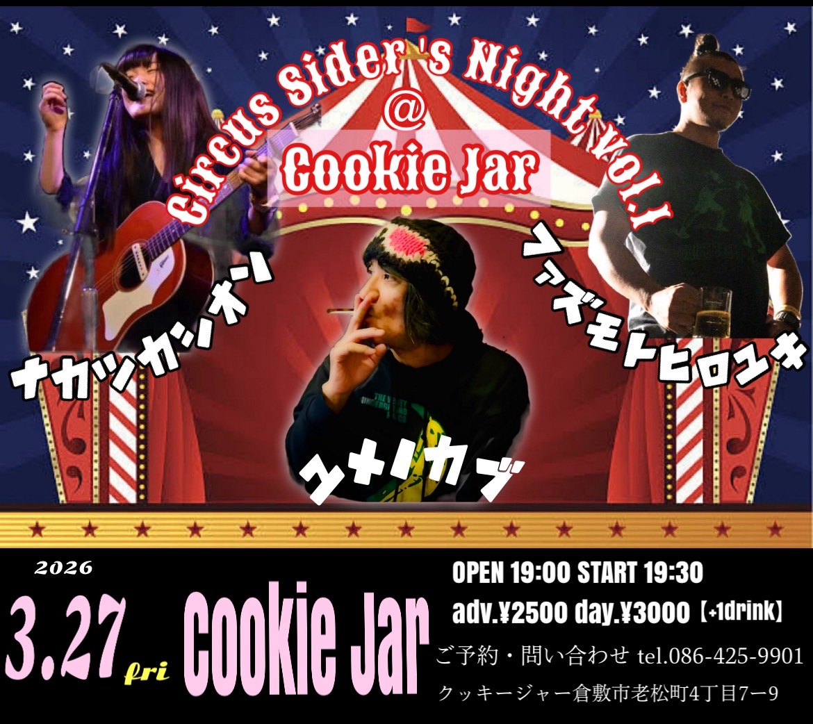 Circus Sider’s Night vol.1@倉敷 クッキージャー 3月27日 START 19:00 倉敷 クッキージャー 〒710-0826 岡山県倉敷市老松町4丁目7−9 夢野カブ 中塚詩音 ファズモトヒロユキ OPEN 19:00 START 19:30 チャージ: 前売 2,500円 +1drink 当日 3,000円 +1drink