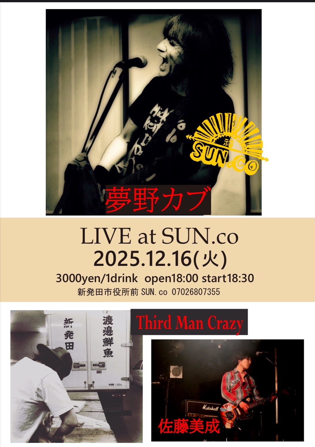 夢野カブ Third Man Crazy 佐藤美成 OPEN 18:00 START 18:30 チャージ:3,000円 +1drink