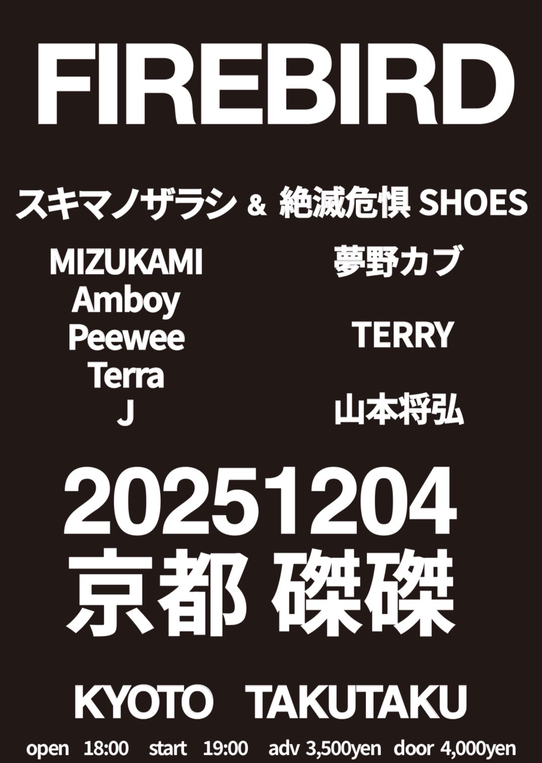 スキマノザラシ MIZUKAMI Amboy Peewee Terra J 絶滅危惧 SHOES 夢野カブ TERRY 山本将弘 OPEN 18:00 START 19:00 チャージ: 前売 3,500円 当日 4,0 […]